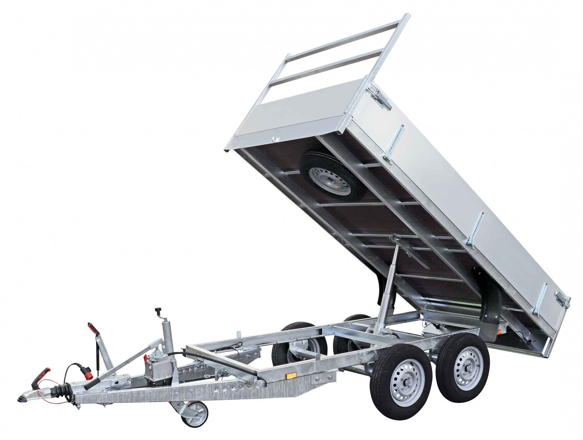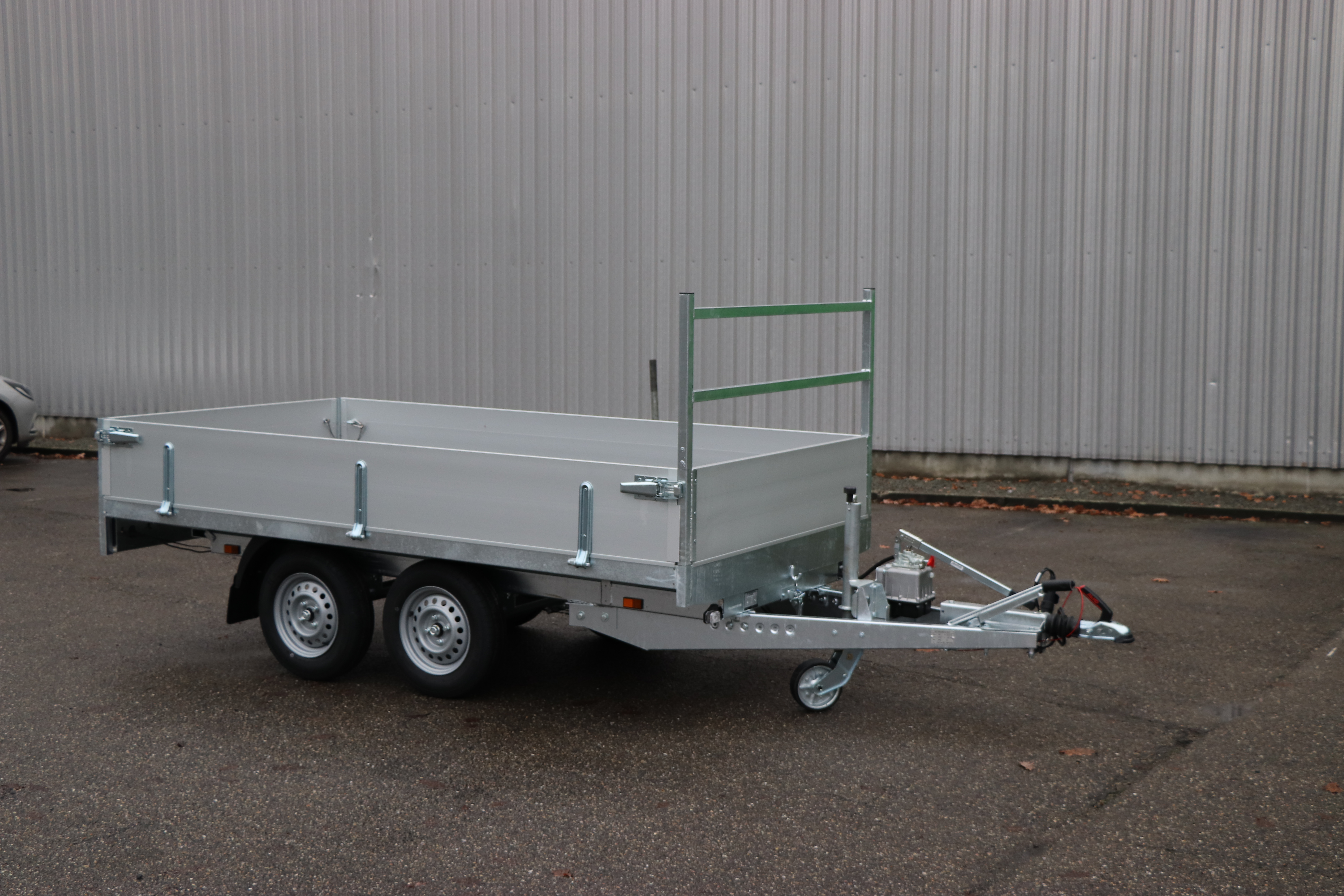 - Kipbak aanhangwagen: Achterwaards elektrisch kippend met voorziening voor oprijbruggen - Binnenafmeting: 3500x1800x350 Buitenafmeting: 5000x1930x1990 Hoogst toegelaten gewicht: 3000kg. Toegelaten laadgewicht: 2090kg Tarra: 910kg. Bandenmaat 185R14. Prijs: 6033.06€+btw= 7300€.