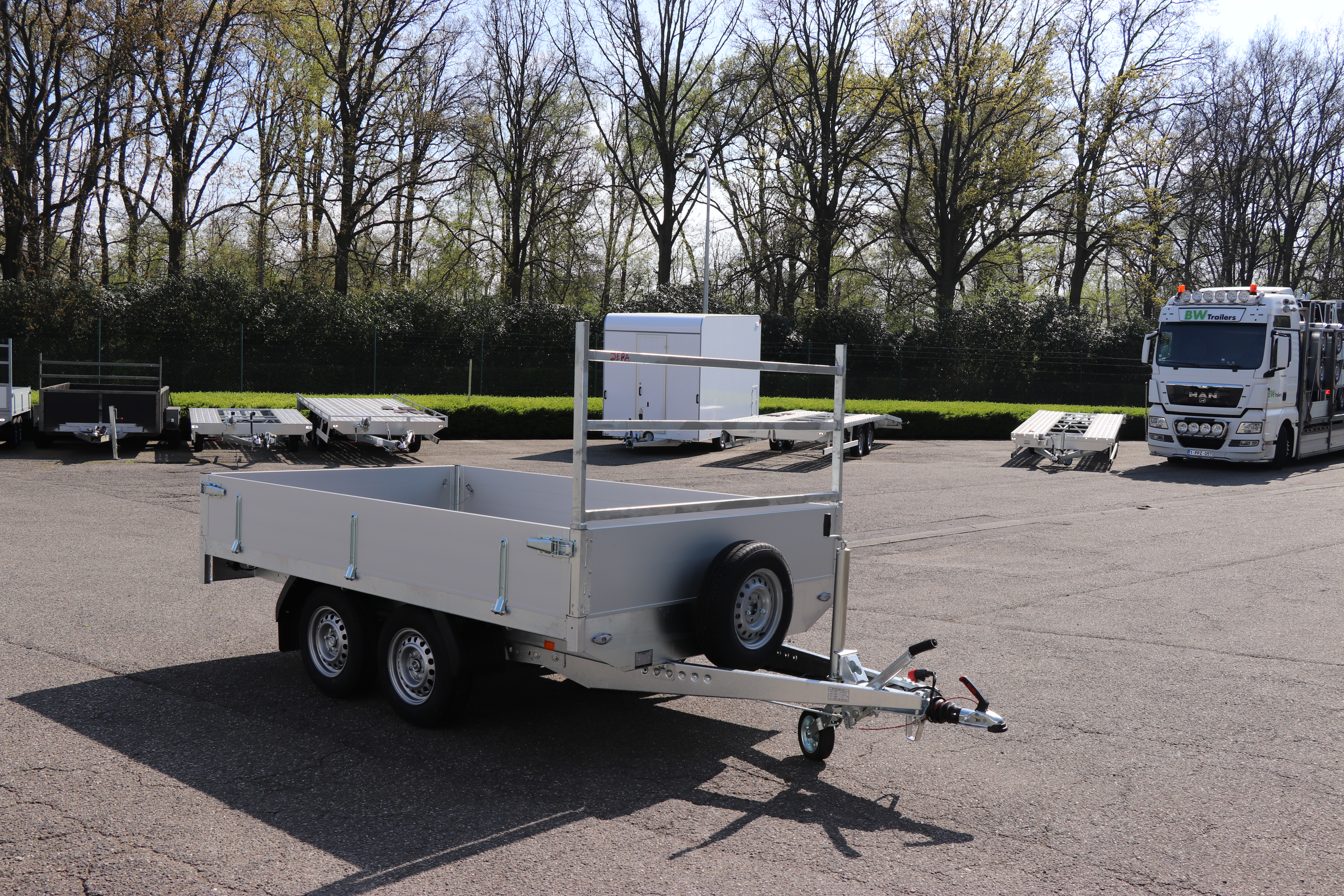 - Geremde plateau aanhanwagen Niet Kippend Type2 Dubbel as 2700kg. Met voorziening voor oprijbruggen BW. Binnenafmeting: 3000x1800x350. Buitenafmeting 4500x1930x1925 Toegelaten laadvermogen: 2160kg. Tarra: 540kg Bandenmaat: 165R13c Prijs: 3347.11€+btw= 4050€.