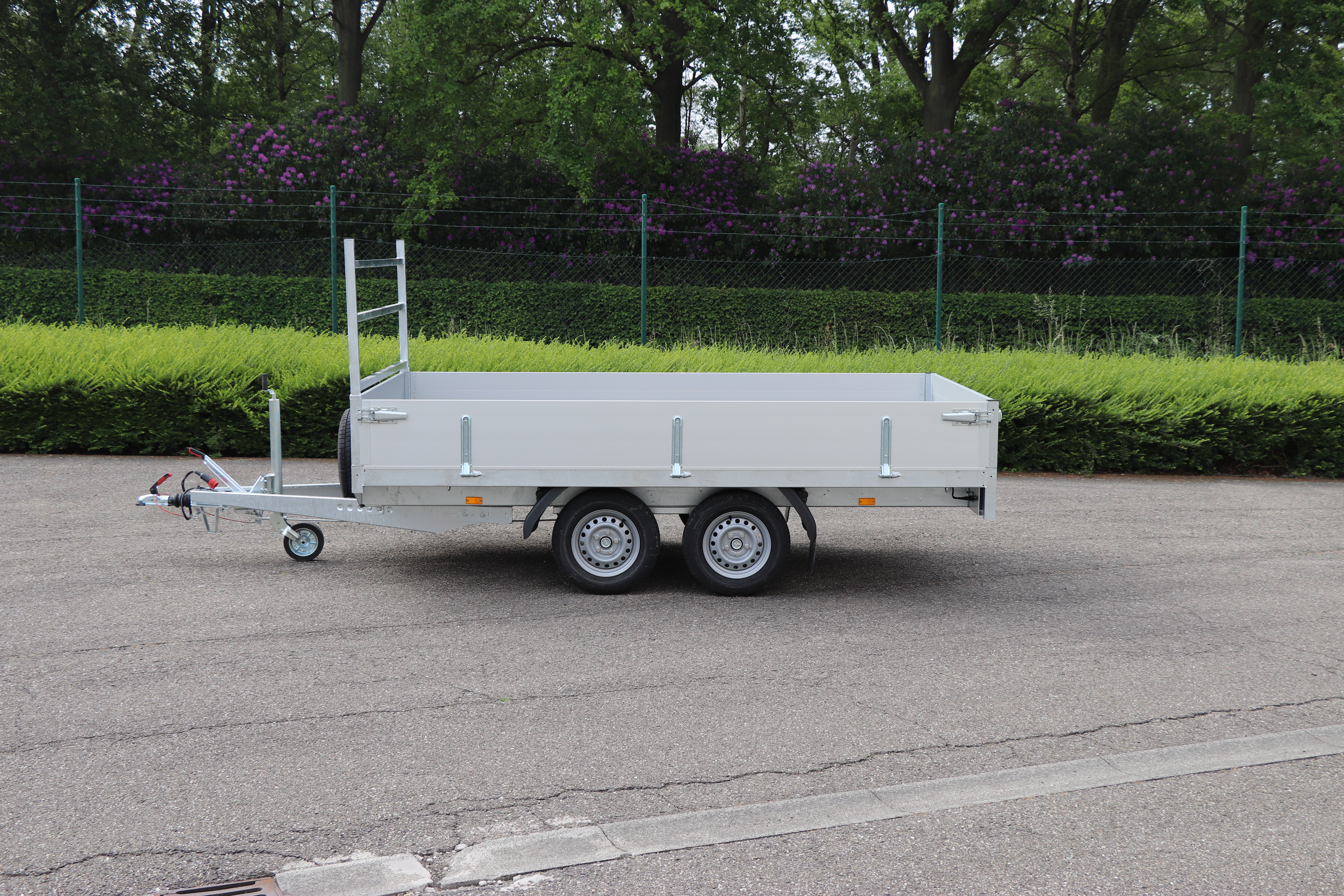 - Geremde plateau aanhangwagen Niet Kippend Type2 Dubbel as 1500kg. Met voorziening van oprijbruggen Binnenafmeting: 4000x1800x350 Buitenafmeting: 5500x1930x1925 Prijs: 3388.43€+btw= 4100€.