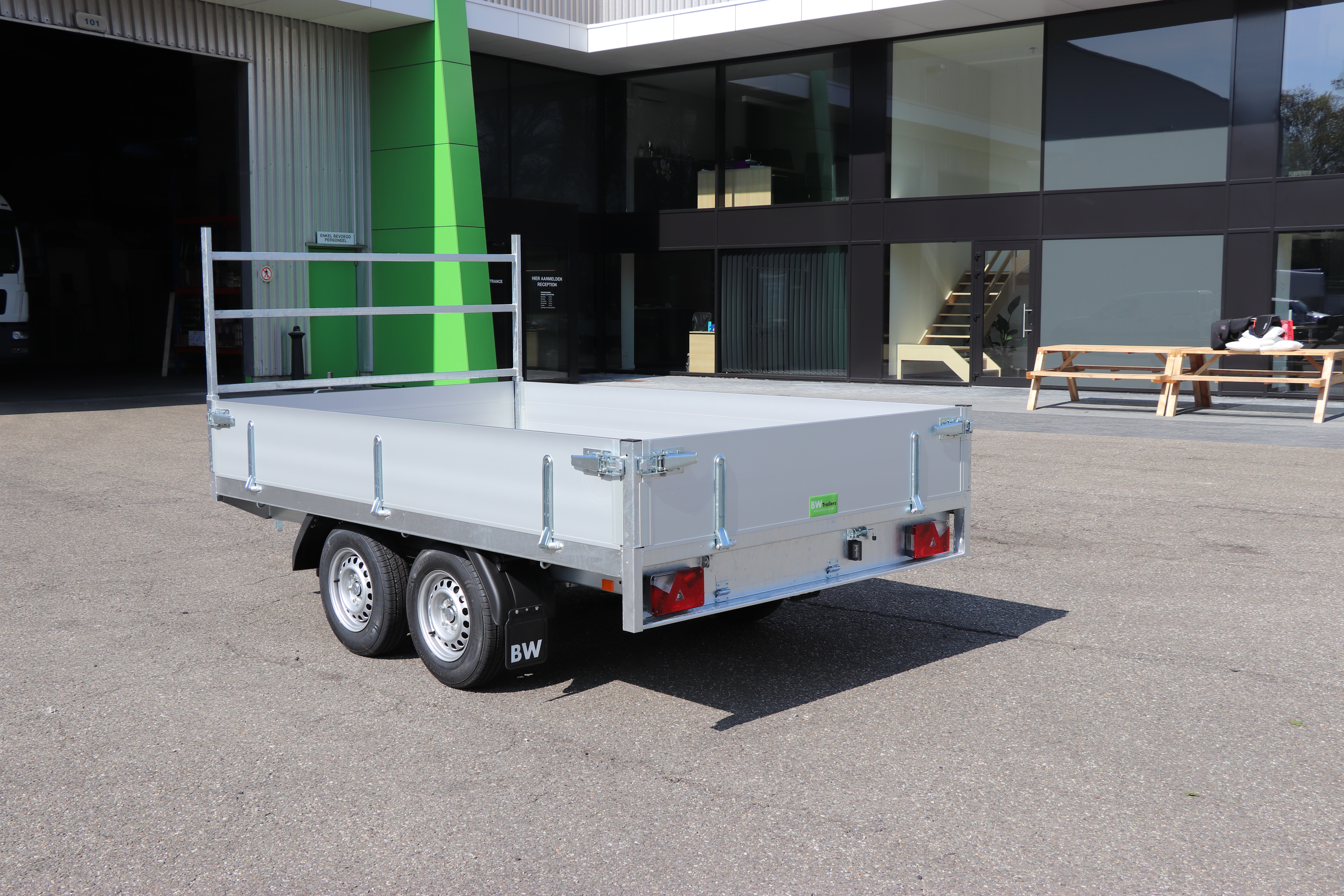 - Opbouw: Aluminium 350mm hoog voor plateau en kipbak aanhangwagen: 3300x1800 Prijs: 590.91€+btw= 715€.