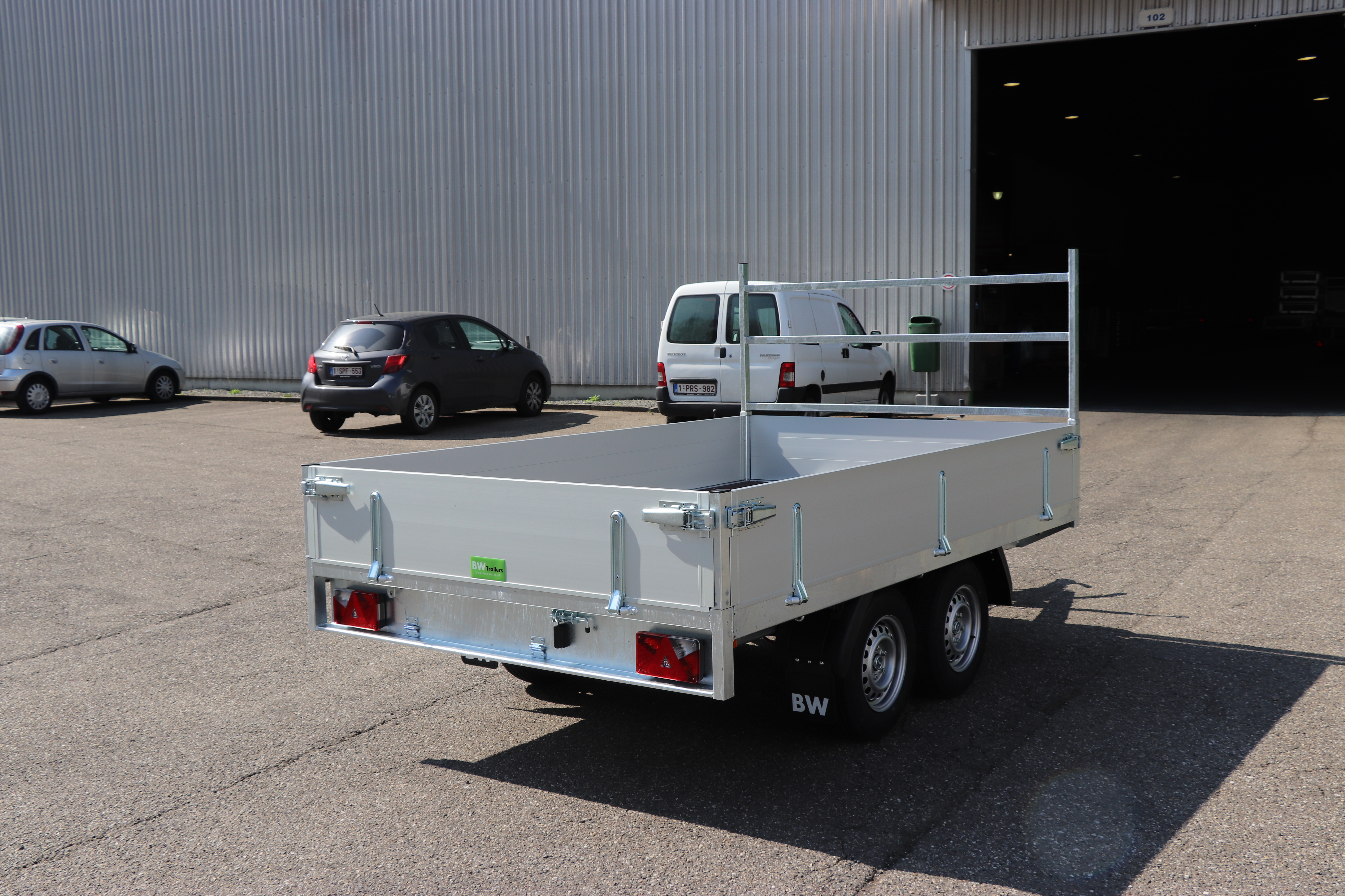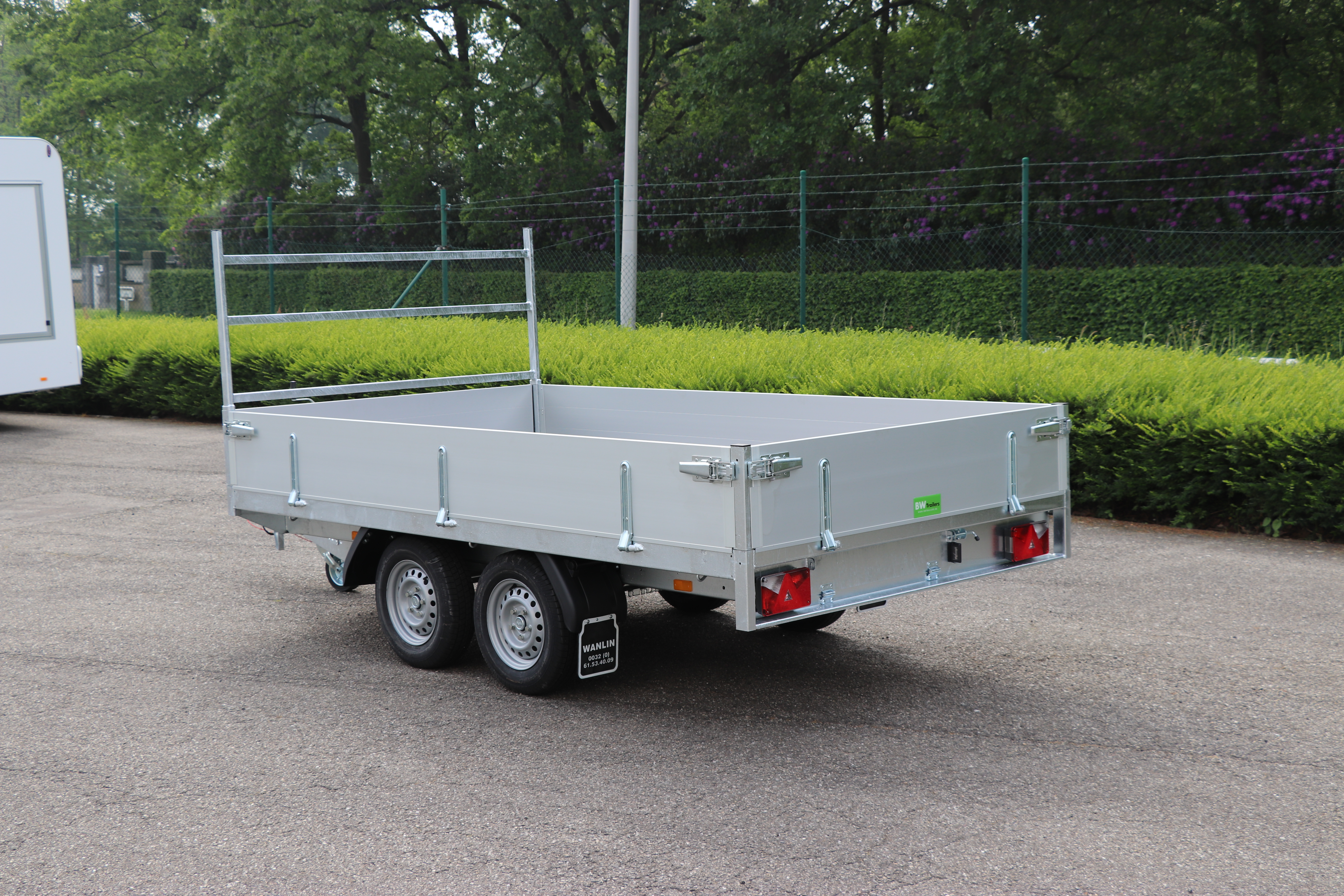 - Geremde plateau aanhanwagen Niet Kippend Type2 Dubbel as 1500kg. Met voorziening voor oprijbruggen BW. Binnenafmeting: 3000x1800x350. Buitenafmeting 4500x1930x1925 Toegelaten laadvermogen: 1030kg. Tarra: 470kg Bandenmaat: 155R13 Prijs: 3016.53€+btw= 3650€.