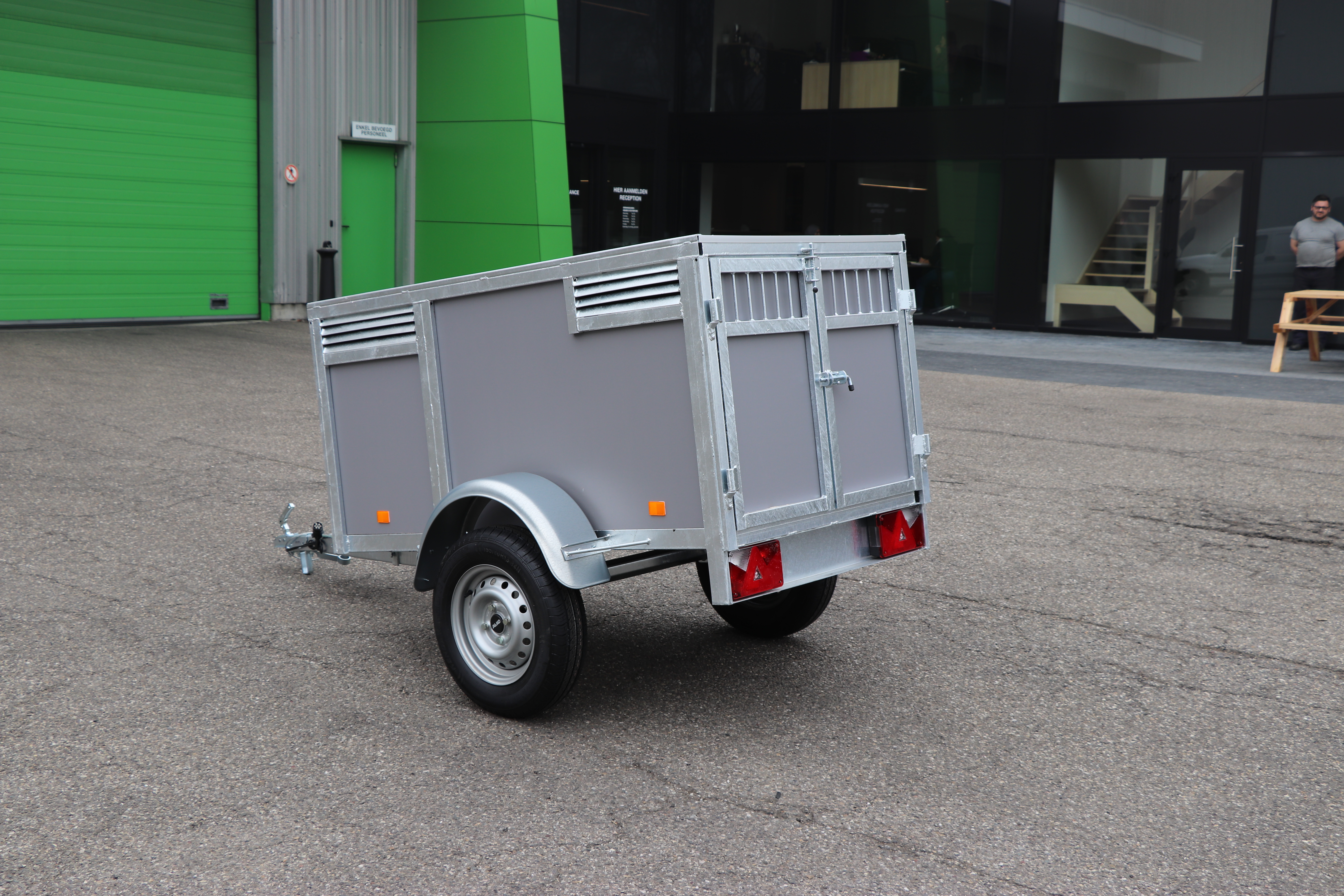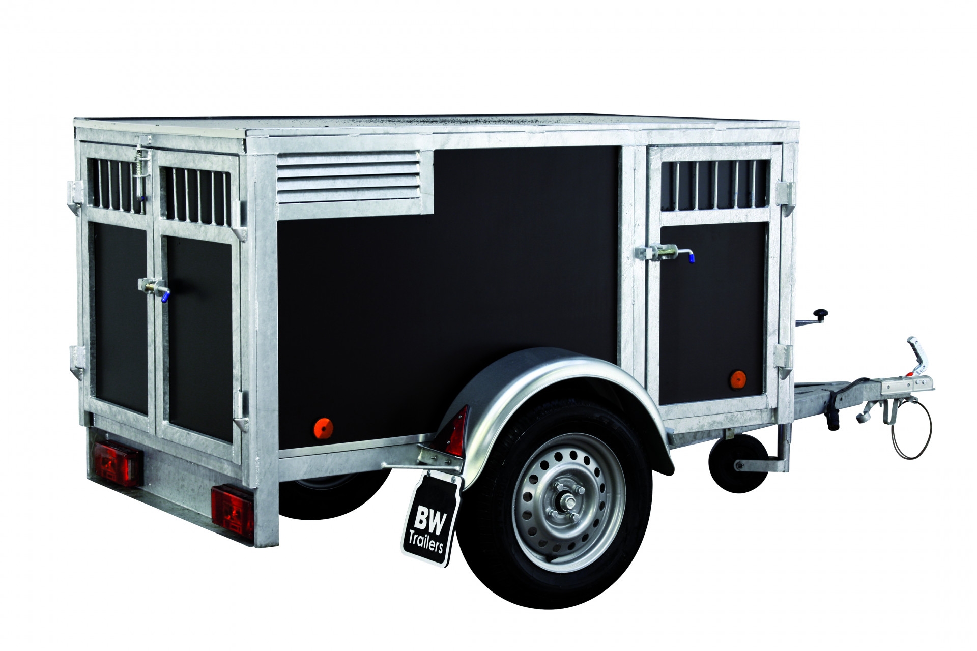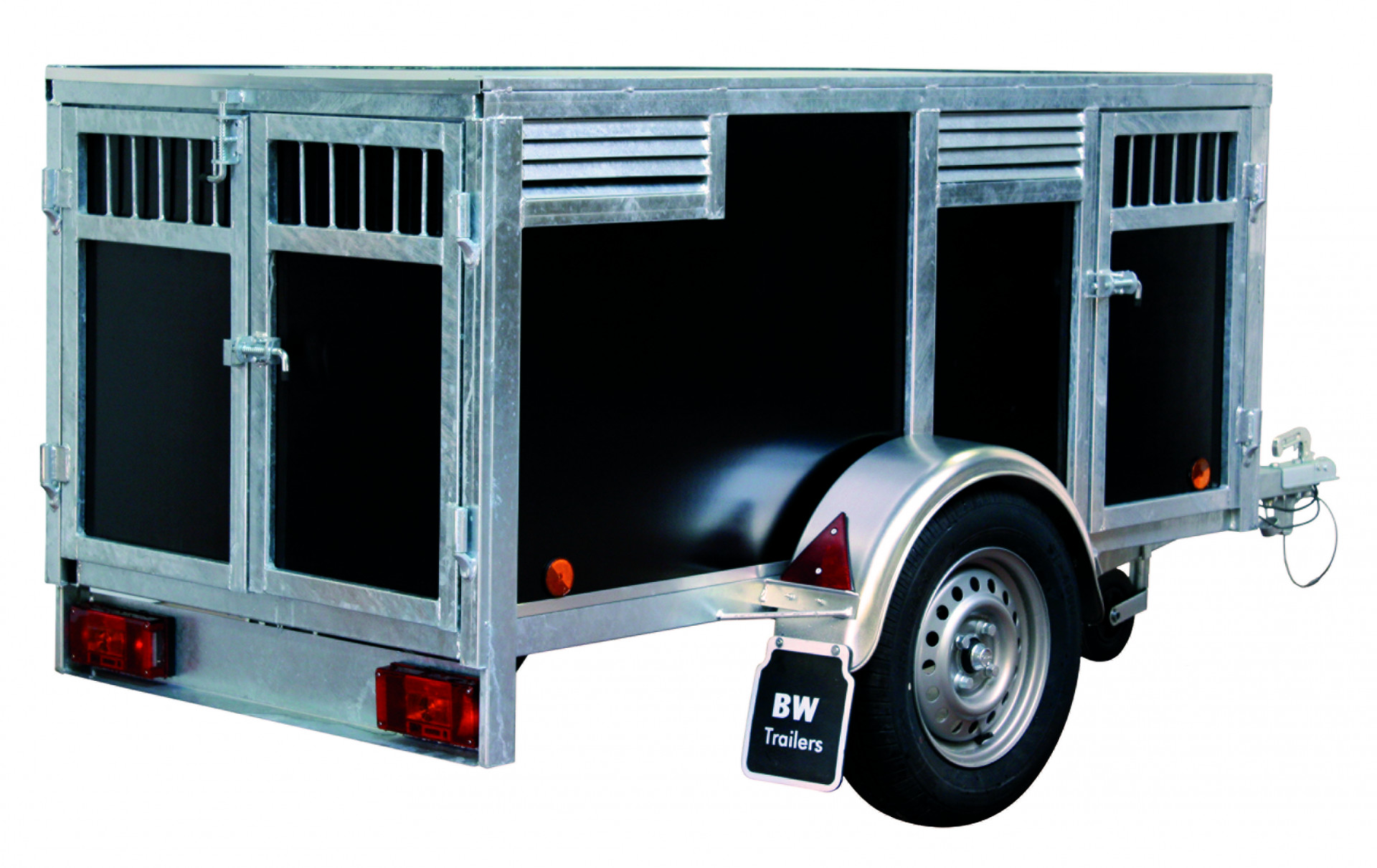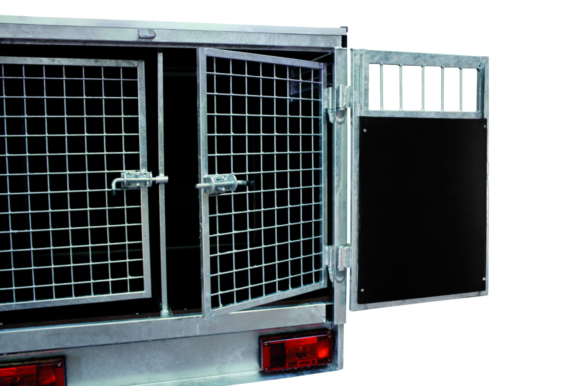 La remorque idéale pour emmener vos chiens en excursion. Divisée en compartiments séparés pouvant accueillir deux à quatre chiens. Chaque compartiment est équipé d'une grille d'aération et d'une porte intérieure verrouillable en filet métallique.
