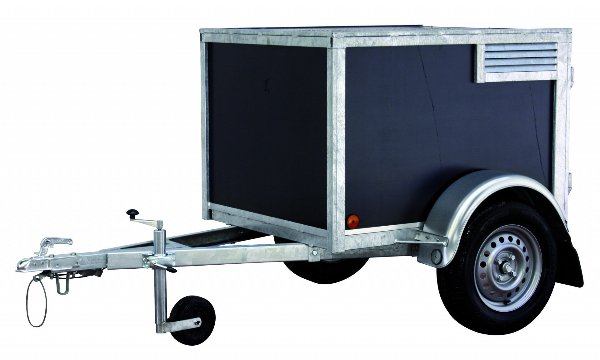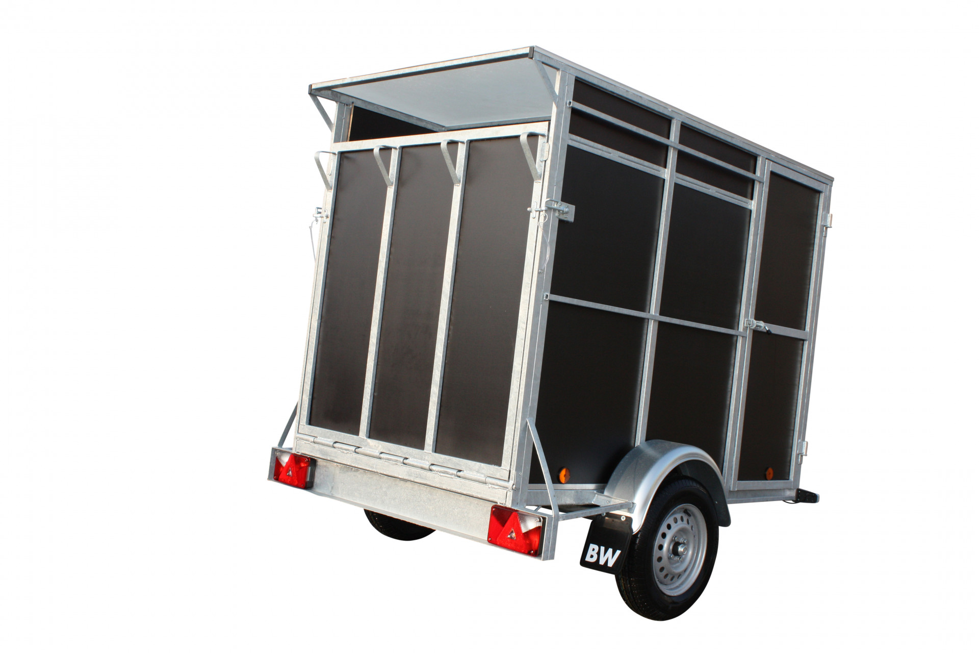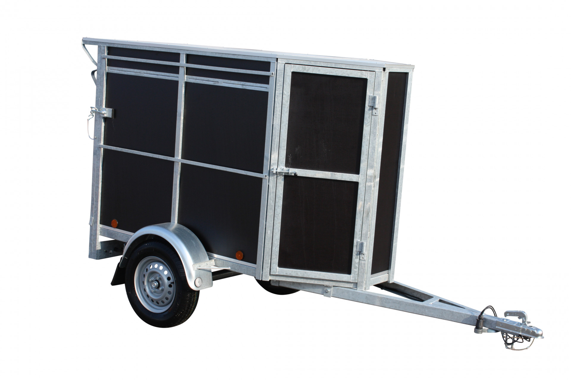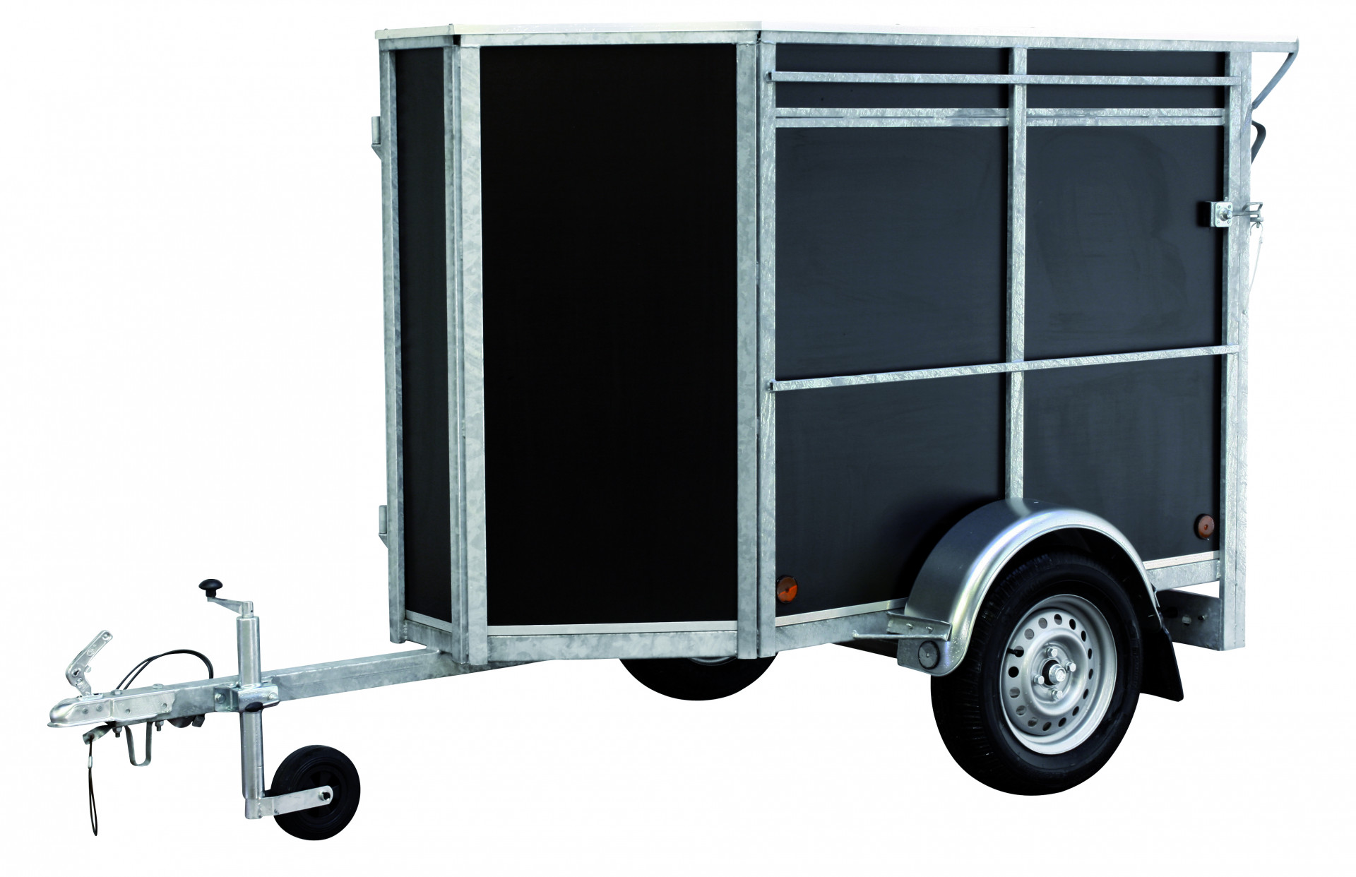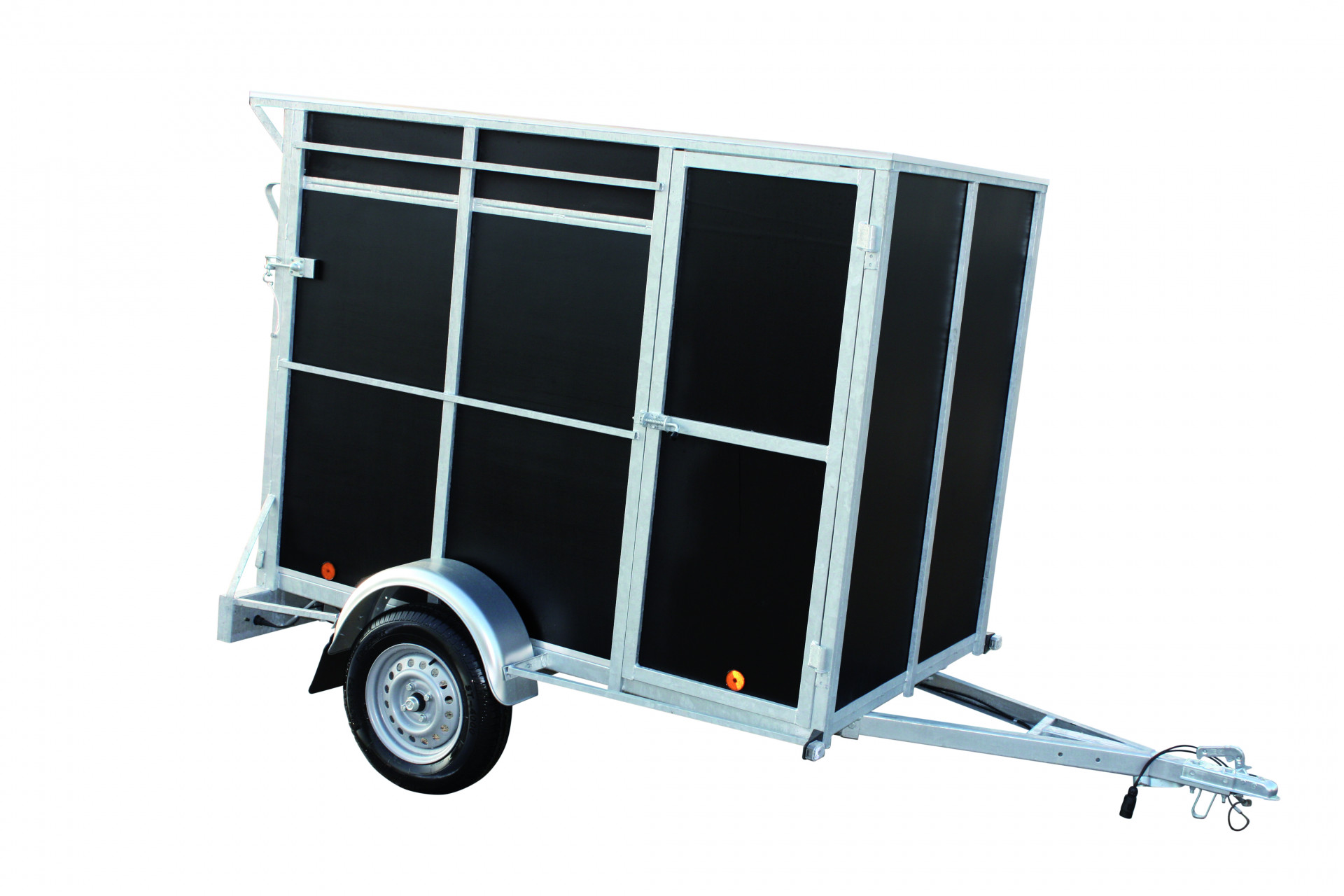 La remorque idéale pour emmener vos chiens en excursion. Divisée en compartiments séparés pouvant accueillir deux à quatre chiens. Chaque compartiment est équipé d'une grille d'aération et d'une porte intérieure verrouillable en filet métallique.